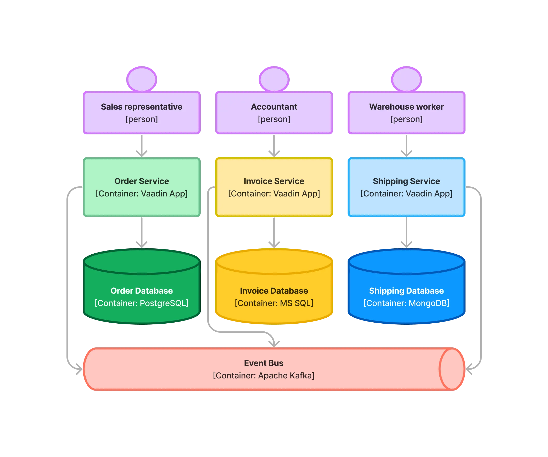 In this fictional organization, orders, invoicing and shipping are handled by separate departments. Each department has its own microservice with a Vaadin UI specialized for their needs. The microservices are also communicating with each other through an event bus.